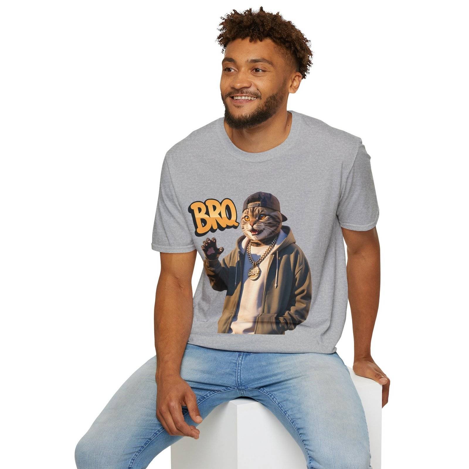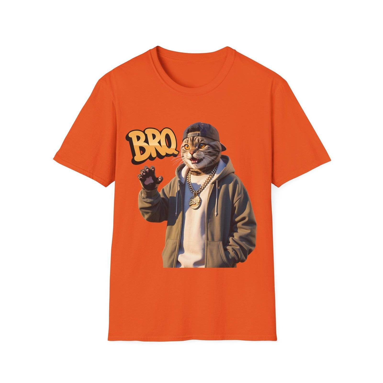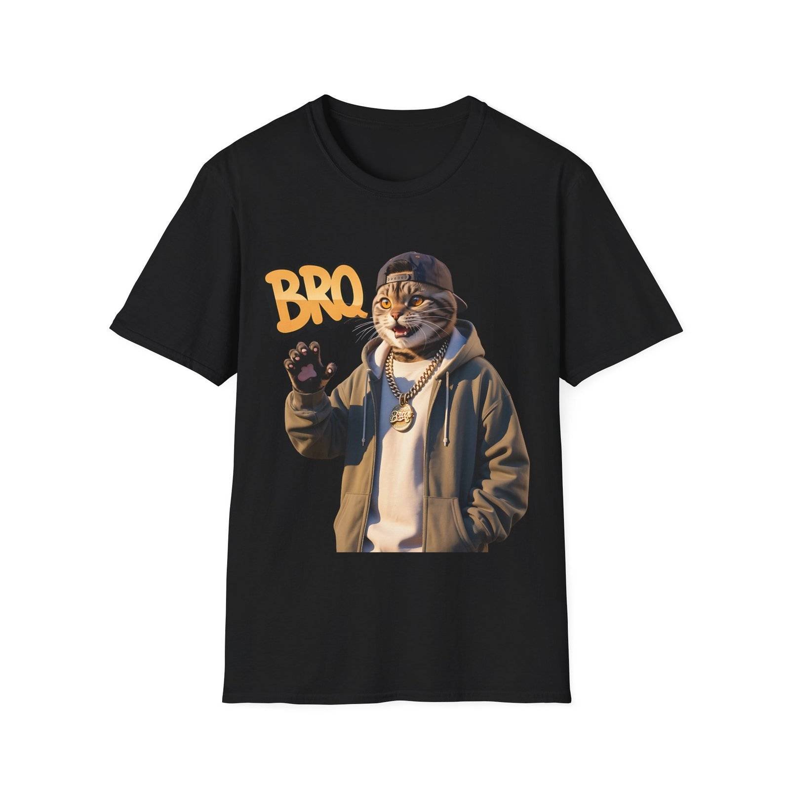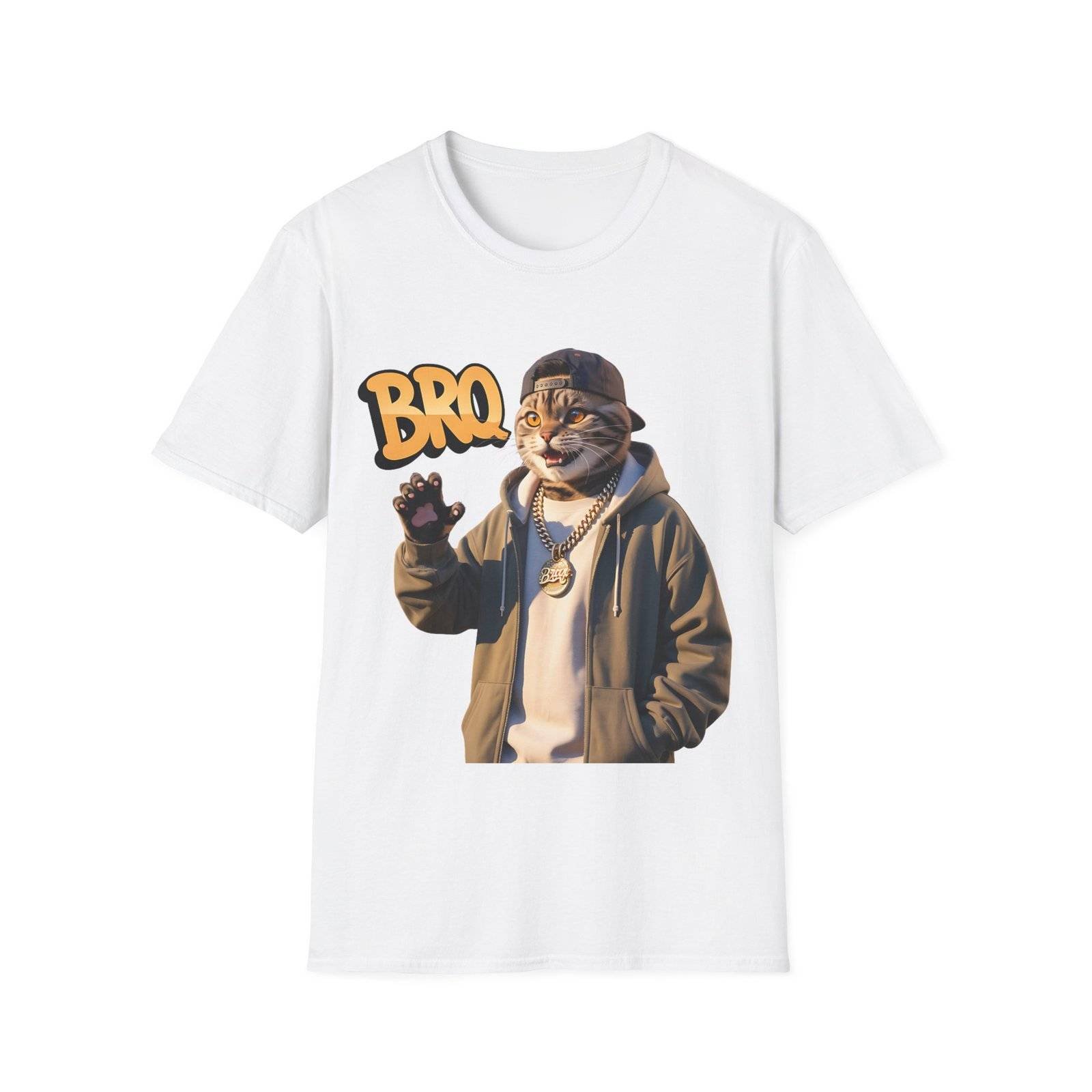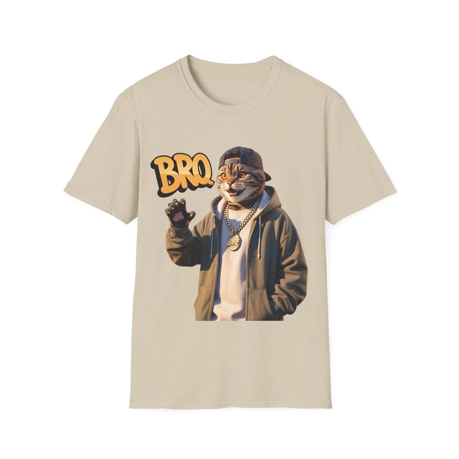 This lightweight crew-neck tee brings a laid-back, streetwise vibe to everyday wear. The design features a stylized, anthropomorphic cat in a hoodie and chain, flashing a casual wave beneath bold “BRO” lettering — a playful mix of urban attitude and soft humor.