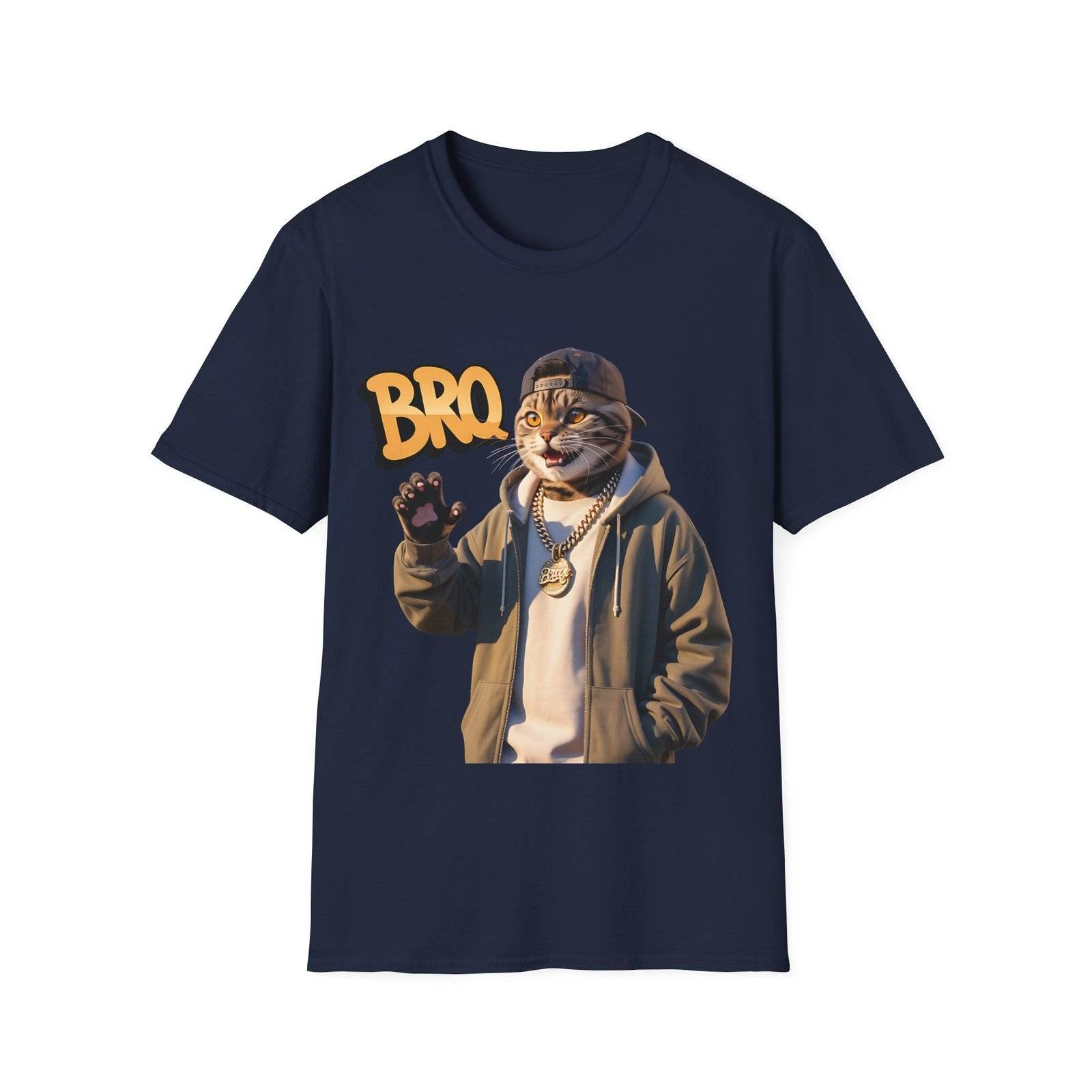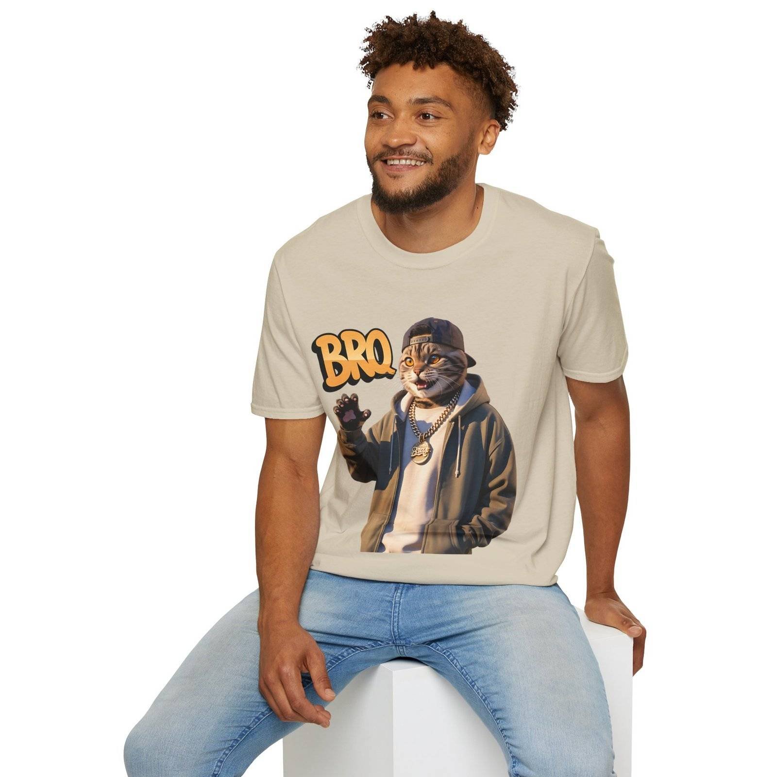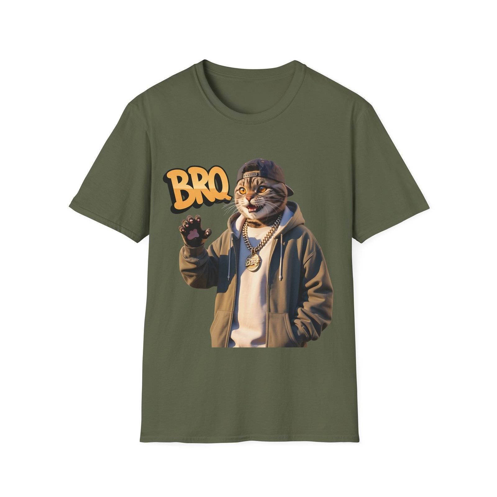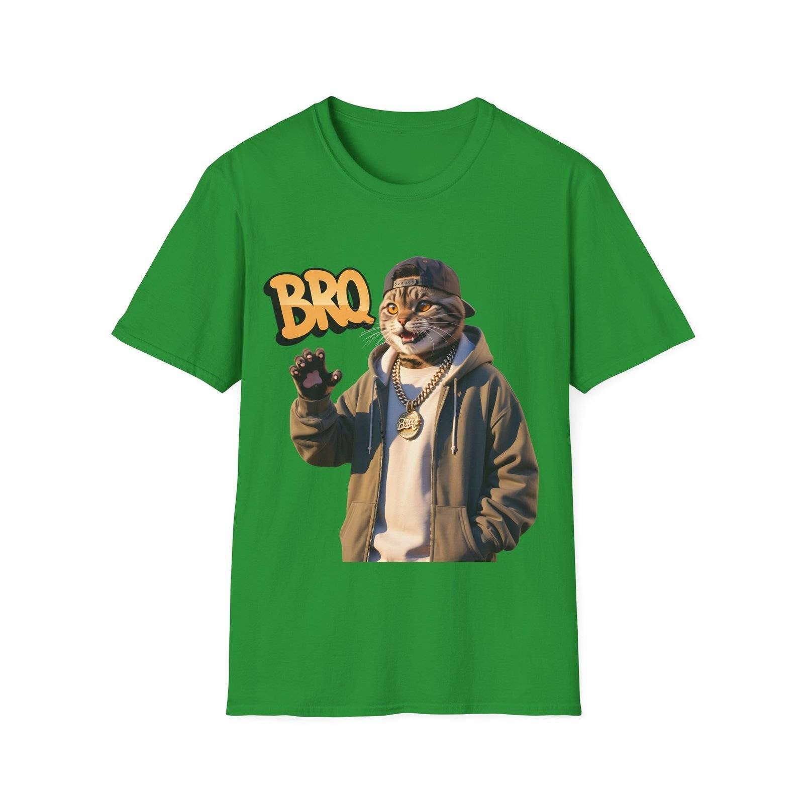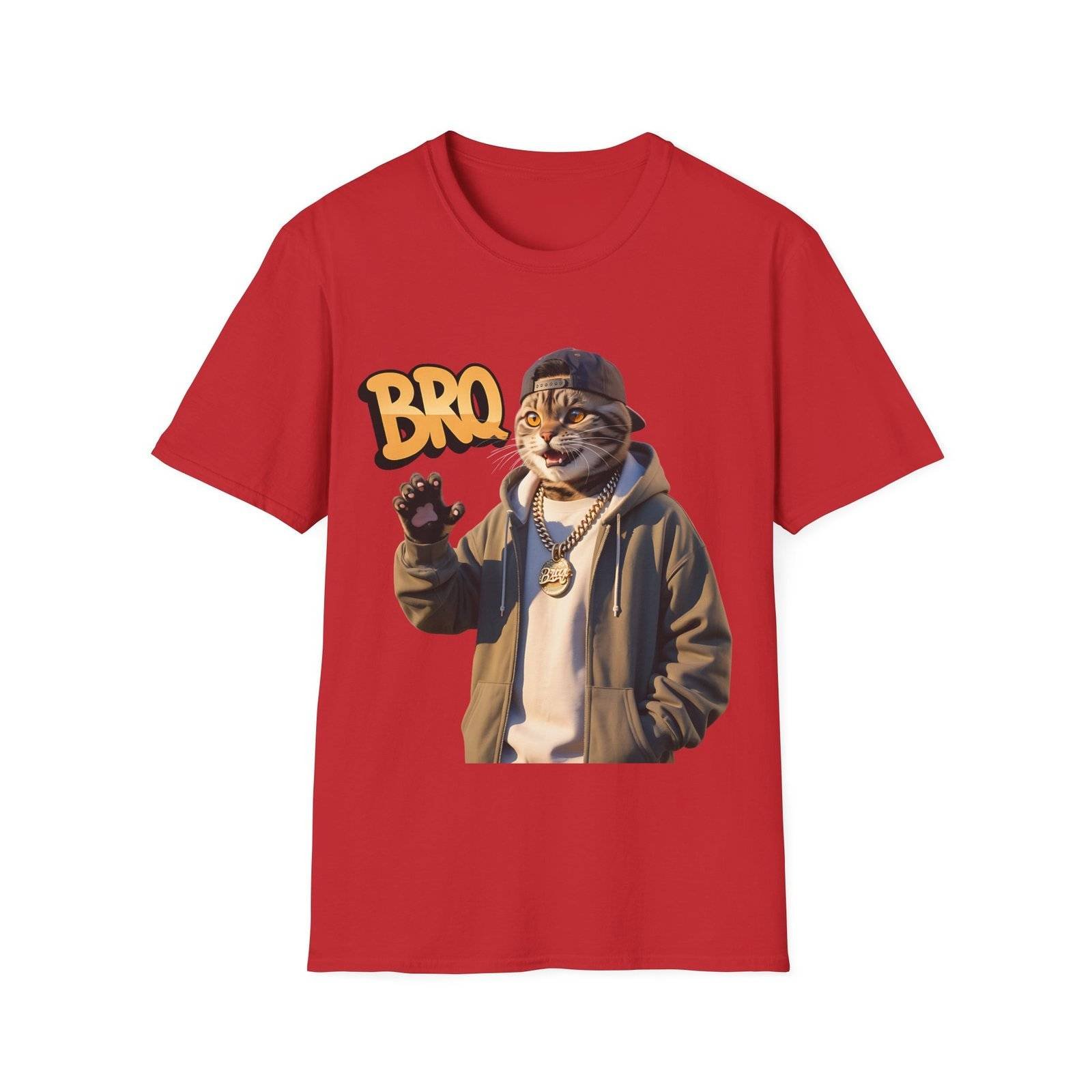 This lightweight crew-neck tee brings a laid-back, streetwise vibe to everyday wear. The design features a stylized, anthropomorphic cat in a hoodie and chain, flashing a casual wave beneath bold “BRO” lettering — a playful mix of urban attitude and soft humor.