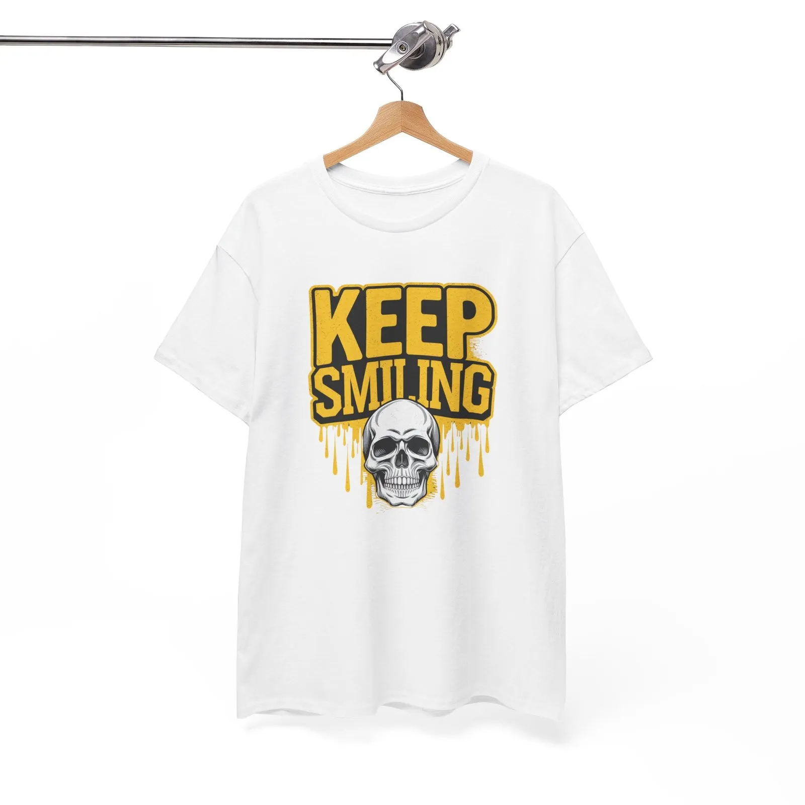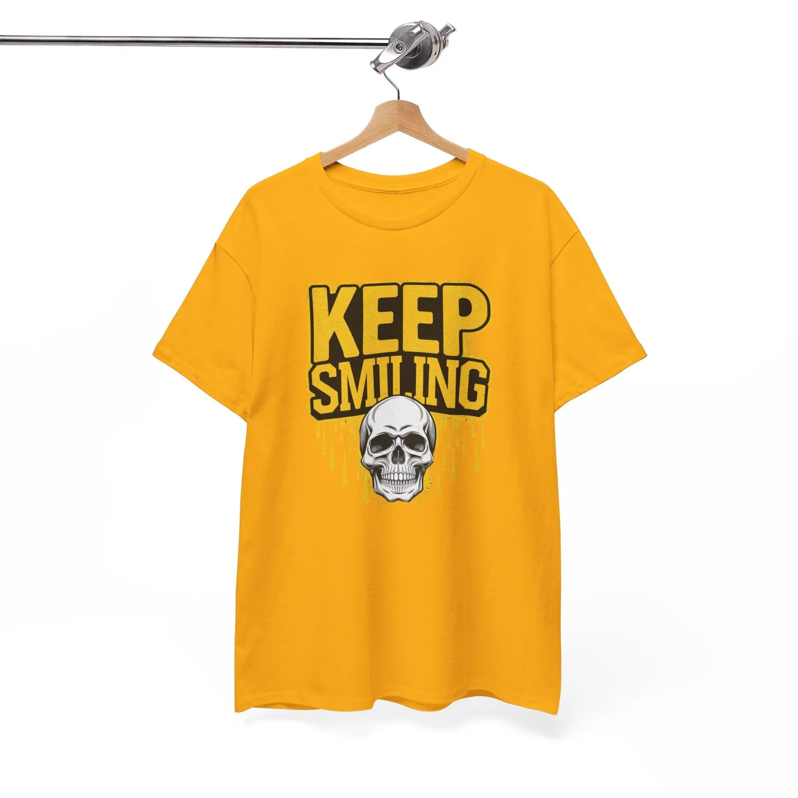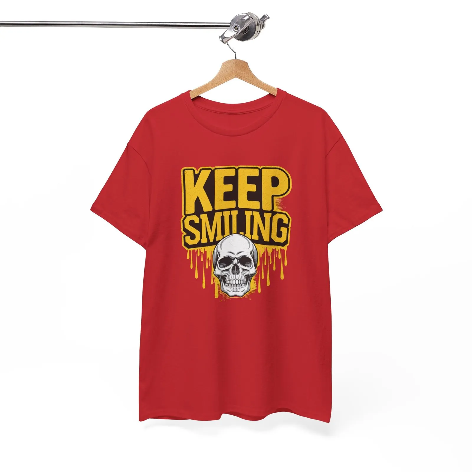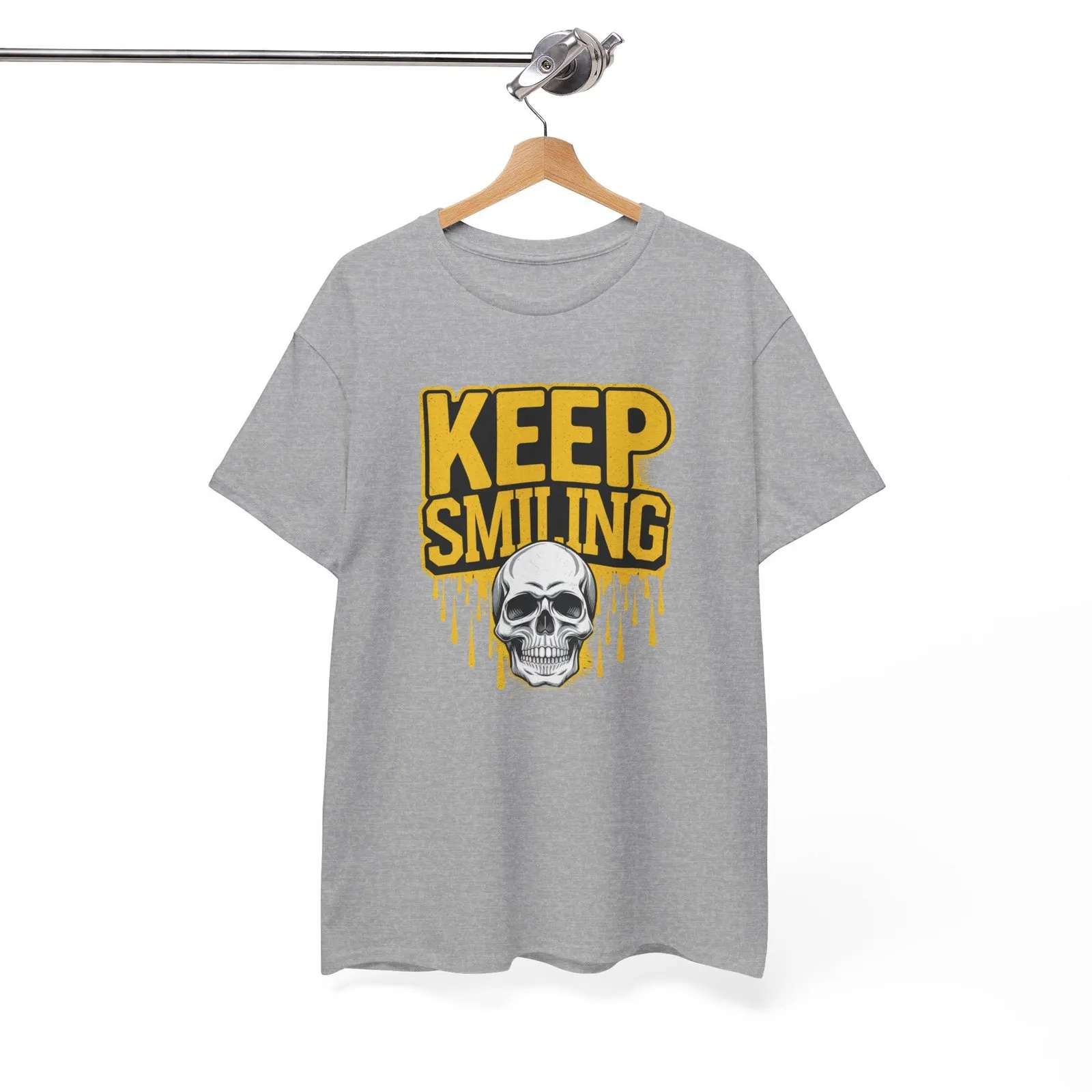 Add a touch of gothic charm to your wardrobe with the “Keep Smiling” T-Shirt. This edgy design combines a grinning skull with a hint of dark humor, perfect for those who love to stand out. Made with soft, high-quality fabric, this tee is both comfortable and durable, ideal for daily wear or making a bold statement. Whether you’re at a casual hangout or embracing your unique style, this T-shirt is your go-to piece.